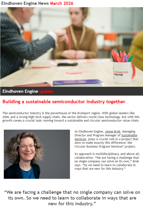 In this edition of Eindhoven Engine News: Building a sustainable semiconductor industry together, two grants, each 50K for Livable region and Inclusive society & more.